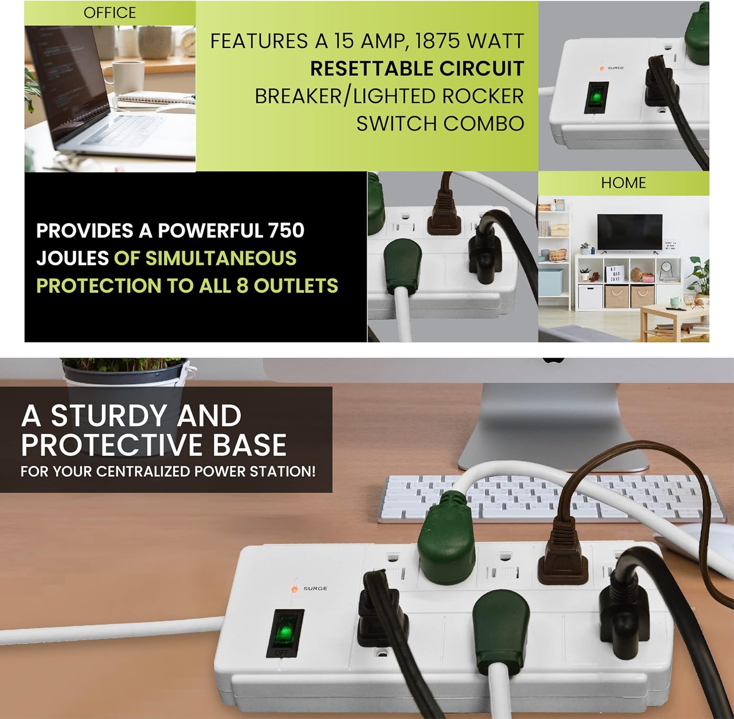 The GoGreen Power (GG-18316WH) Eight Outlet Surge Protector is the solution to the situations where you need something a bit more heavy duty to protect your electrical appliances. When the going gets tough, the tough gets going, and this power outlet surge protector lives up to the saying! The surge strip comes with a robust 15 amp, 1875 watt resettable circuit breaker/rocker switch combo, that protects your unit in case of a surge spike. This safety feature helps protect various electrical appliances such as televisions, computers, laptops and much more! Also built into the circuit breaker/rocker switch is an indicator light that confirms operation for the unit. It comes with 5 standard adapters and 3 large adapters. Our 8 outlet surge protector provides 750 joules of simultaneous protection against electrical power surges for its 8 adaptors, all at once, making it ideal for almost any indoor electrical appliances. Hook up your charger to it, television or charge your laptop, or use it to power your desktop at the office! The possibilities are endless with this surge protector. The 6 foot service cord attached to the surge protector is constructed of 14-gauge SJT cable housed in a durable PVC insulation and jacket that makes this heavy-duty cord strong enough to last a lifetime but pliable enough to be fully extended. The surge strip also offers a sturdy base for your centralized power station by simply attaching your unit where you need it most. The included keyhole slots on the back of the surge protector make it a breeze to mount your unit to a wall, desk, workbench or counter. By purchasing this 8 outlet surge protector, you not only will get a high-quality product; but also get ecological peace of mind with hassle-free recycling. We offer free recycling and free shipping back of the used product to our recycling facility. Please view the recycling code and instructions on the back of the package and visit the GoGreen Power website for additional information.